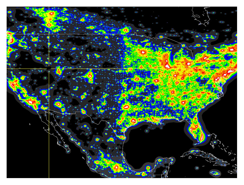Colors correspond to ratios between the artificial sky brightness and the natural sky.